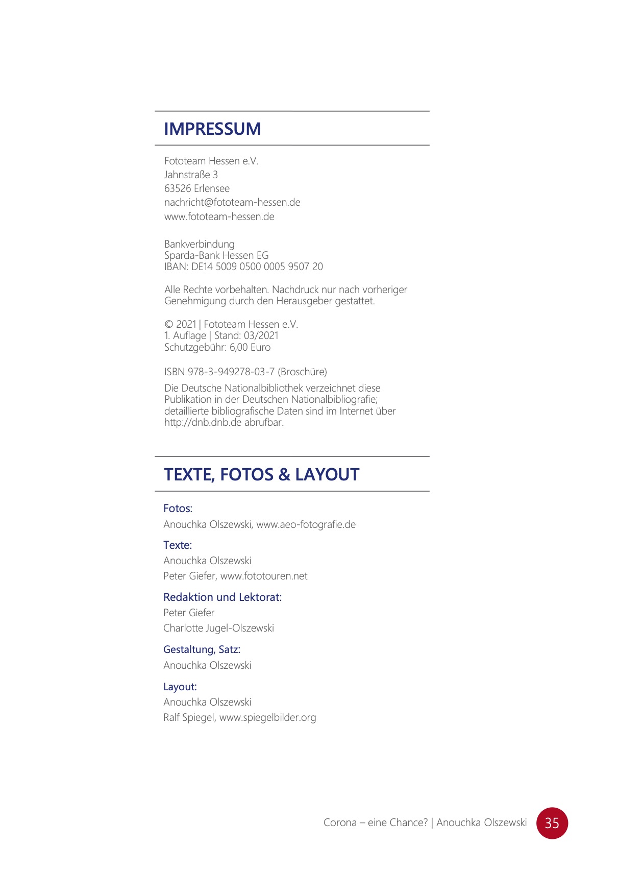 Eine Pandemie als Chance, wie kann das sein? Mit dieser provokanten Frage sprach Anouchka Olszewski zu Beginn des zweiten Lockdowns Menschen in ihrem Umfeld an. Es führte bei den Angesprochenen zuerst zu einem Innehalten und Nachdenken und dann oft zum Beginn zahlreicher Gespräche, aus denen die Interviews und Fotos zu diesem Projekt entstanden sind. Die zentrale Frage für sie wurde, woraus die Menschen ihre Kraft in dieser Zeit der Ängste und Einschränkungen gezogen haben? Gab es positive Veränderungen in ihren Gewohnheiten und wie wahrscheinlich ist es, dass diese über die Zeit der Pandemie hinaus beibehalten werden. Die Broschüre fasst eine Auswahl der Gespräche zu diesem Mut-mach-Projekt in Foto und Text zusammen.