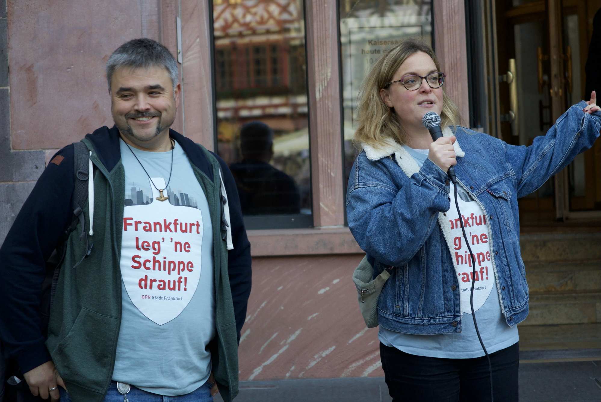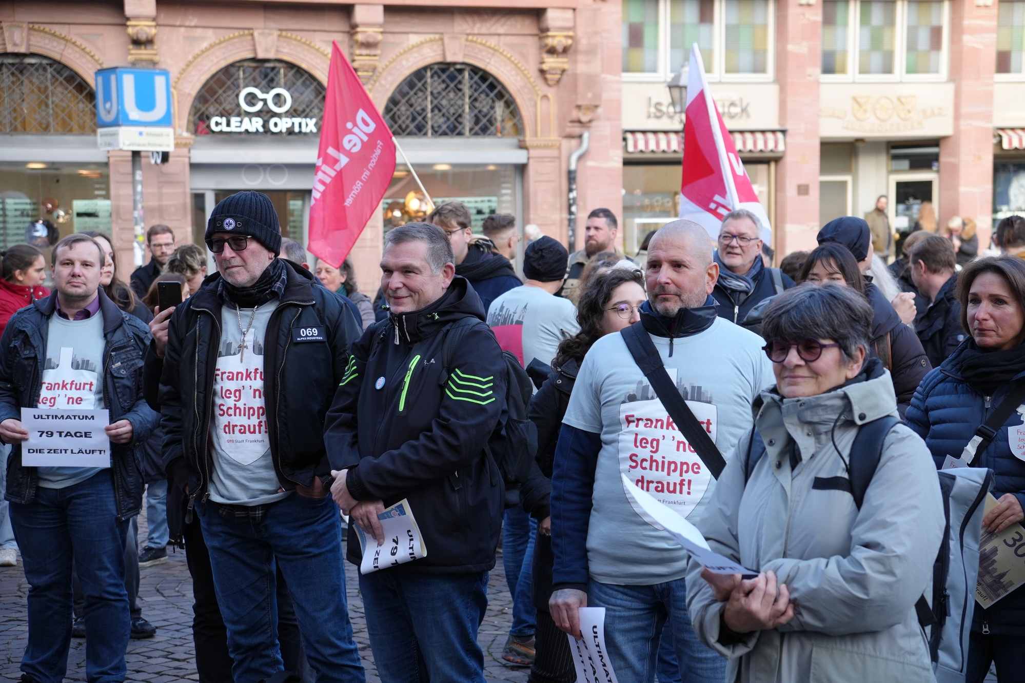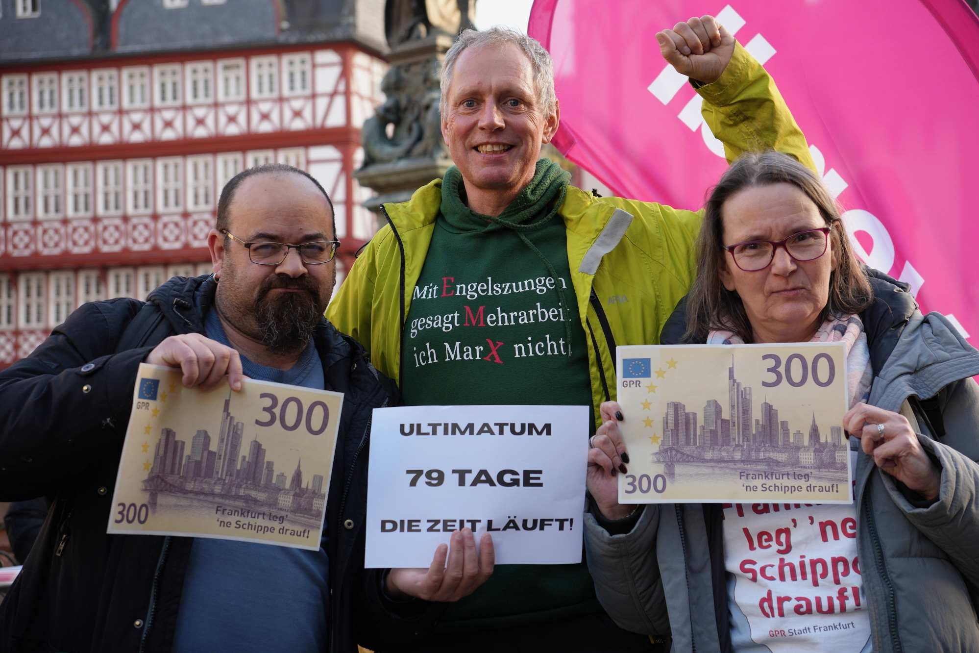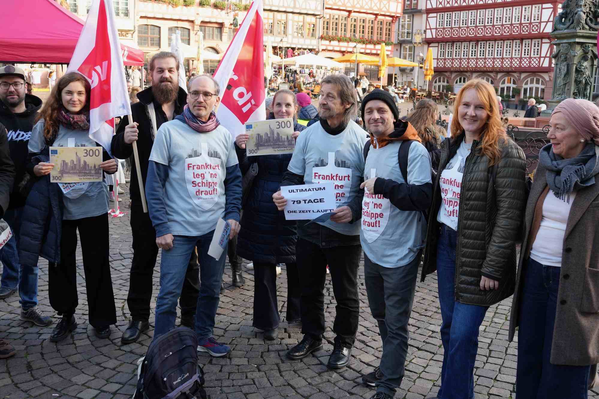 Die Beschäftigten der Stadt Frankfurt fordern eine Ballungsraumzulage in Höhe von 300 Euro um Jobs in der Stadtverwaltung attraktiver zu machen. Um dem enormen Fachkräftemangel entgegenzuwirken und das Wohnen in der Stadt für die Beschäftigten bezahlbar zu machen, ist diese Zulage dringend notwendig. Am Donnerstag, den 6.11. versammelten sich zahlreiche Kolleg:innen aus mehreren städtischen Betrieben auf dem Römerberg um ihre Forderungen deutlich zu machen. Sie überreichten ihre Unterschriften Übergabe der Unterschriften an die Stadtverordnetenvorsteherin Hilime Arslaner.