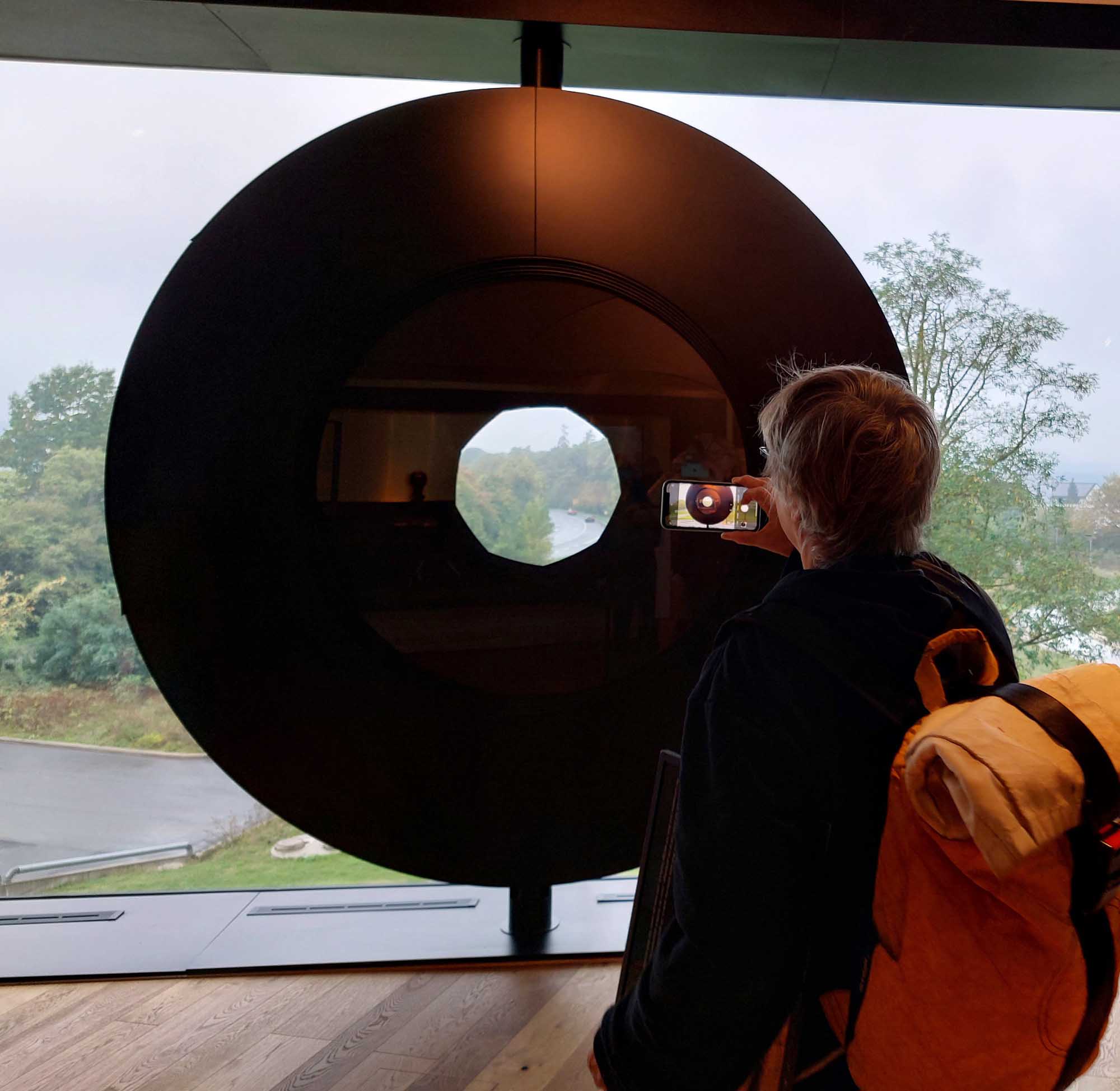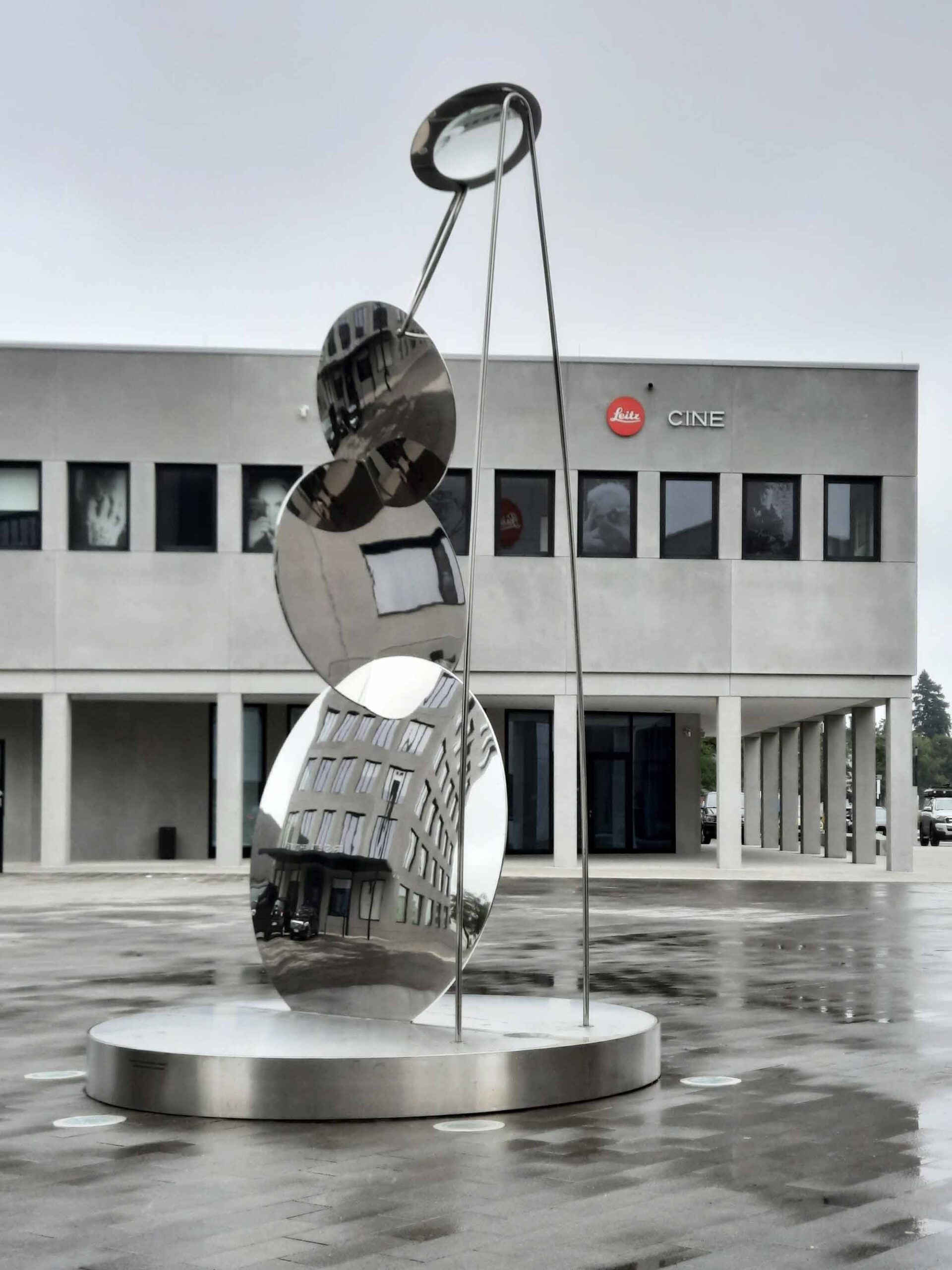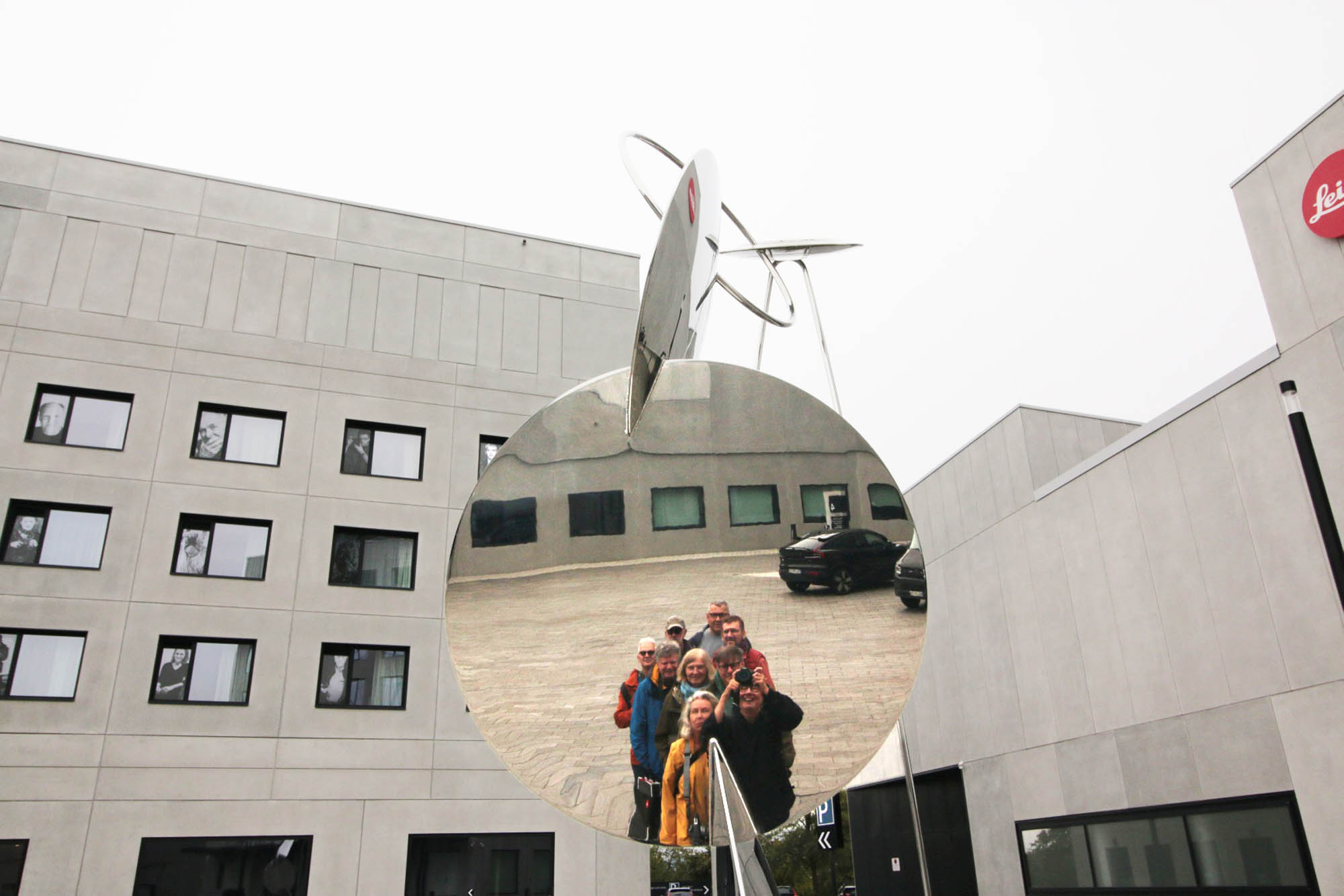 Beim Verlassen des Gebäudes fällt uns wieder ein roter Punkt auf dem Boden ins Auge. Ein kleines Gruppenfoto im großen Spiegel ist das Ergebnis. Wir erfahren, dass das Besondere an diesem Gewerbepark von Leica ist, dass die Gebäude und die Leica-Welt von einer Gruppe von Architekten, Designern und Fotografen gemeinsam entworfen wurde. Ein Teil des Gebäudes, welches das Headquarter beherbergt, wirkt auf uns wie ein überdimensionales Objektiv.