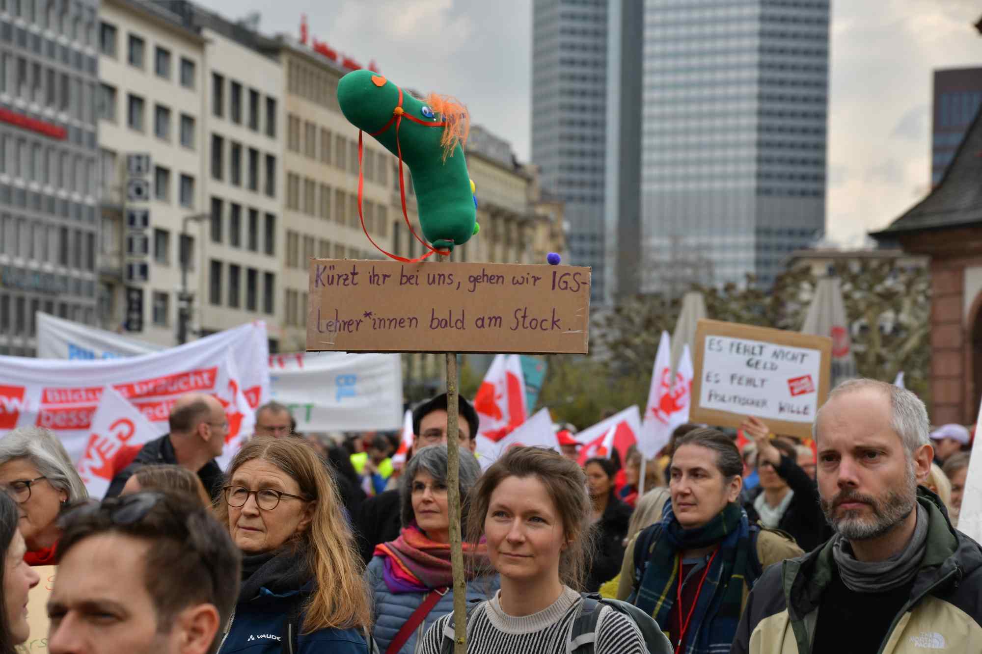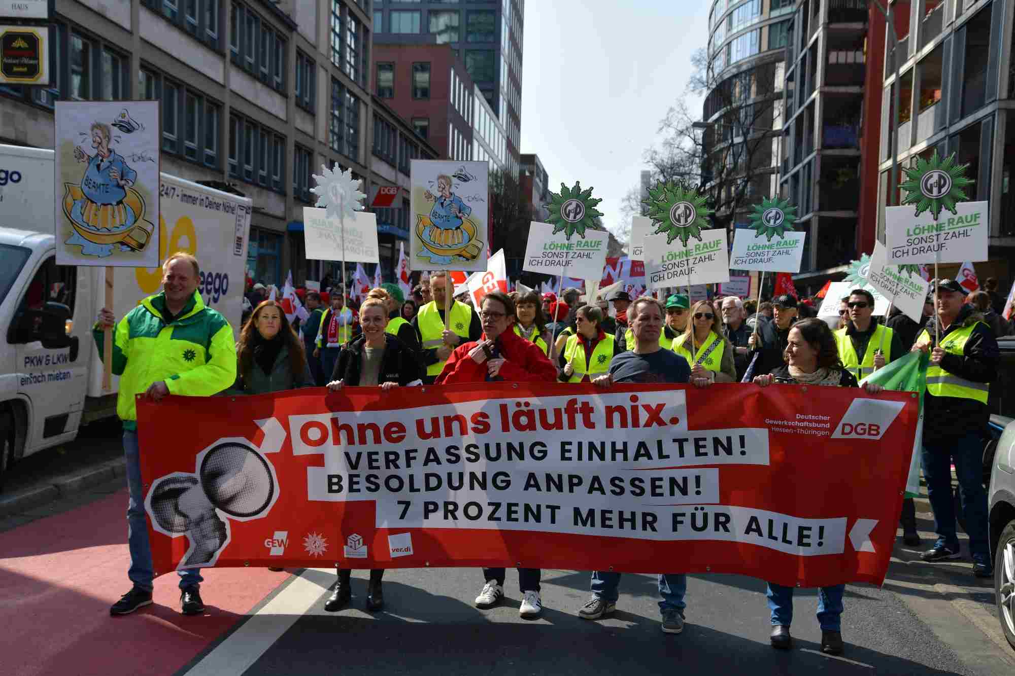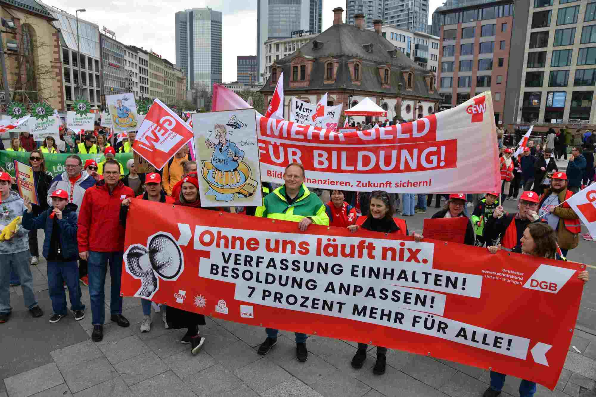 Auf die Straße für einen guten Tarifabschluss! Die Tarifrunde für den öffentlichen Dienst des Landes Hessen (TV-H) geht in die heiße Phase. Während wir in den Verhandlungen für spürbare für den öffentlichen Dienst des Landes Hessen kämpfen, braucht es jetzt ein klares Signal von der Straße. Die GEW, GdP, IG BAU und der DGB haben in Frankfurt zur Solidaritäts-Demonstration aufgerufen. Dort kamen ca. 1.000 Kolleginnen und Kollegen zusammen und machten ihre Forderungen lautstark deutlich: 7 Prozent mehr Gehalt, mindestens aber 300 Euro, und einen vollen Monatslohn als Jahressonderzahlung. Studentische Beschäftigte sollen in den Tarifvertrag aufgenommen werden.