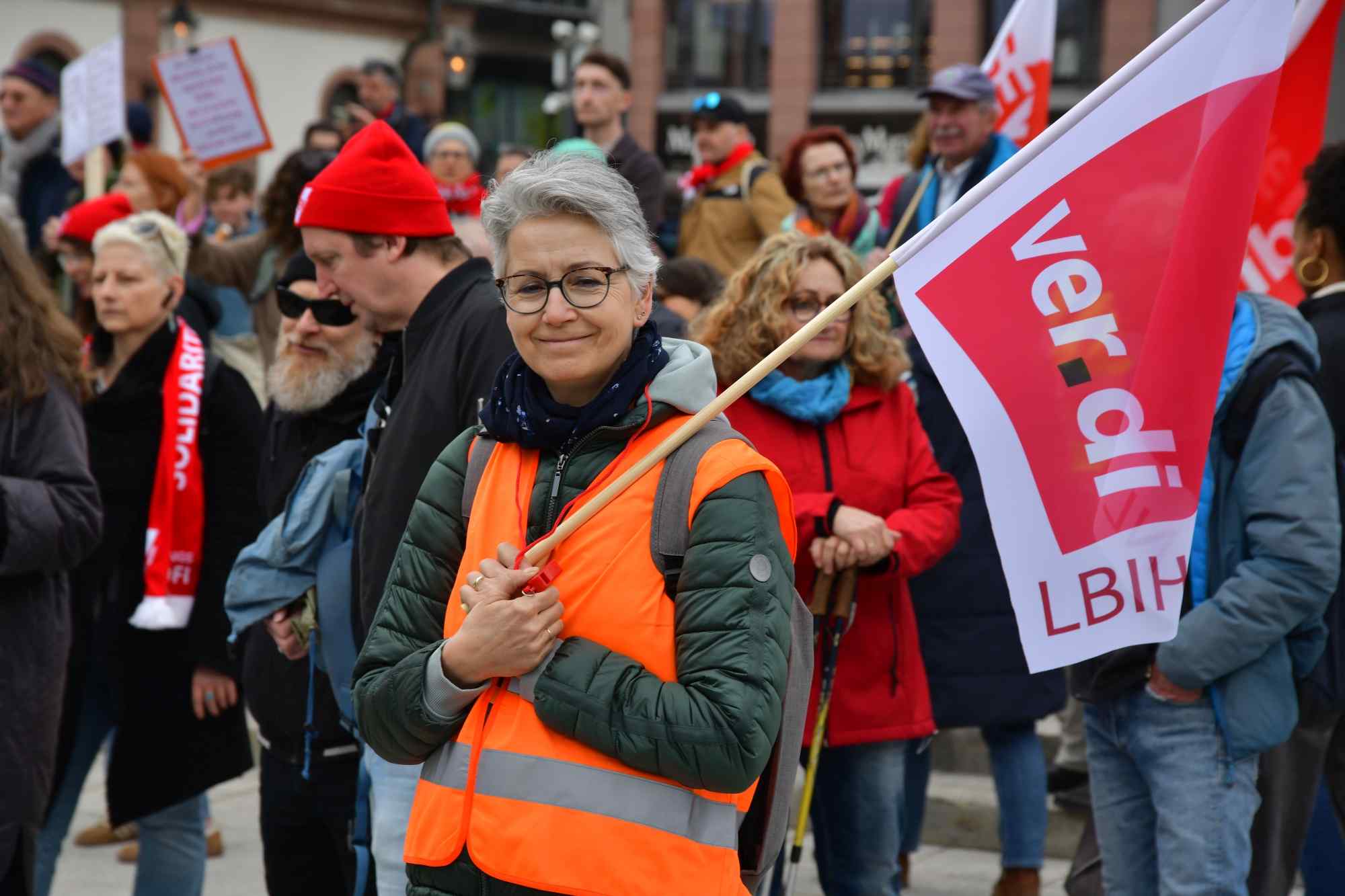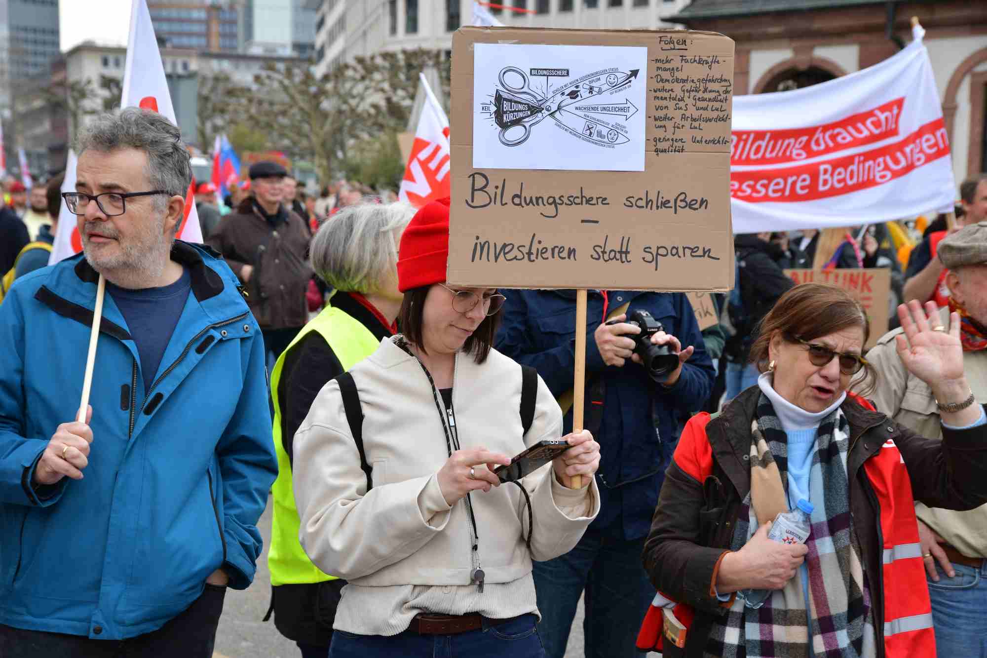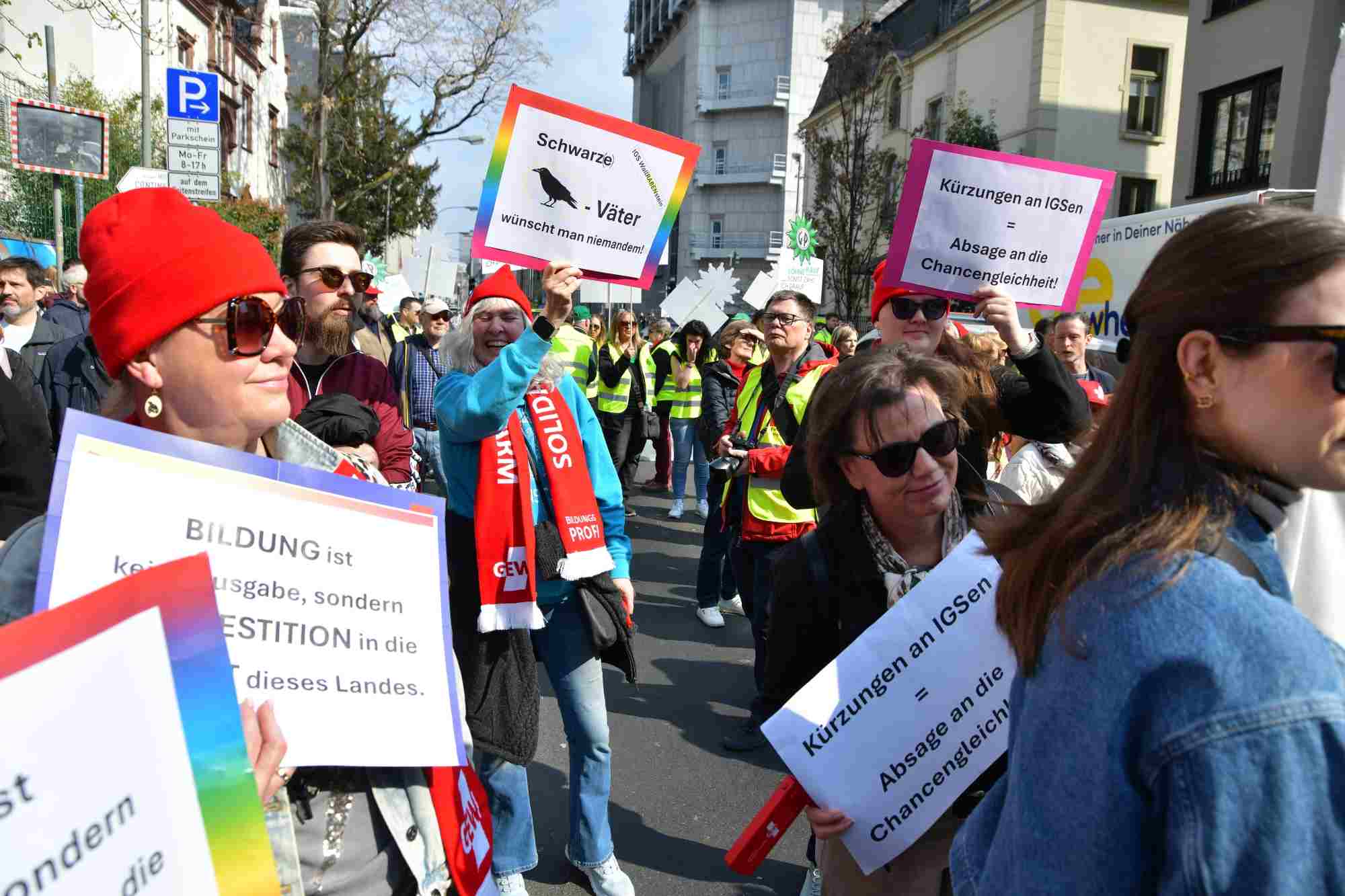 Auf die Straße für einen guten Tarifabschluss! Die Tarifrunde für den öffentlichen Dienst des Landes Hessen (TV-H) geht in die heiße Phase. Während wir in den Verhandlungen für spürbare für den öffentlichen Dienst des Landes Hessen kämpfen, braucht es jetzt ein klares Signal von der Straße. Die GEW, GdP, IG BAU und der DGB haben in Frankfurt zur Solidaritäts-Demonstration aufgerufen. Dort kamen ca. 1.000 Kolleginnen und Kollegen zusammen und machten ihre Forderungen lautstark deutlich: 7 Prozent mehr Gehalt, mindestens aber 300 Euro, und einen vollen Monatslohn als Jahressonderzahlung. Studentische Beschäftigte sollen in den Tarifvertrag aufgenommen werden.