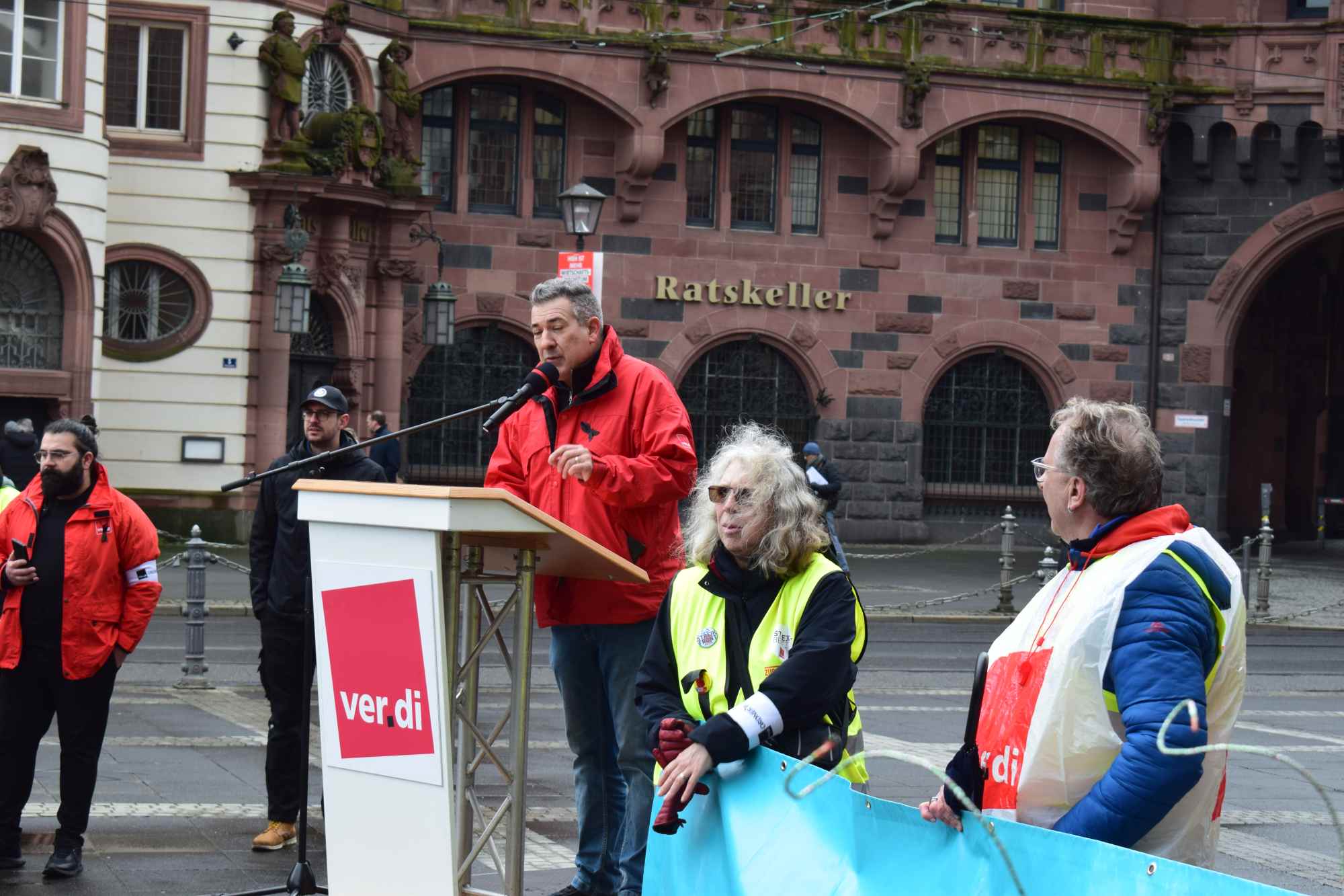 In Frankfurt versammelten sich rund 1.000 Kolleg:innen am Gewerkschaftshaus und zogen in einem Demonstrationszug durch die Stadt. Trotz des schlechten Wetters waren so viele Menschen gekommen um ihre Forderungen nach verbesserten Arbeitsbedingungen und einer Lohnerhöhung deutlich zu machen. verdi fordert 8 Prozent mehr, mindestens aber 350 Euro, für Auszubildende 200 Euro mehr und drei zusätzliche Urlaubstage. Die Personalsituation ist in vielen Bereichen sehr schlecht und die Einkommen halten bei weitem nicht mit der Inflation Schritt, besonders in den niedrigen Einkommensgruppen.