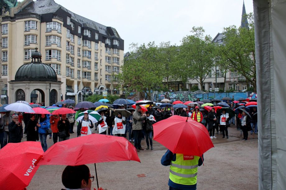 Gute Stimmung trotz strömenden Regens: 450 Beschäftigte der Nassauischen Sparkasse haben sich am Warnstreik in Wiesbaden beteiligt. ver.di fordert für die rund 200.000 Beschäftigten des privaten und öffentlichen Bankgewerbes eine Erhöhung der Gehälter um 6 Prozent. Mau dagegen fiel das Angebot der Arbeitgeber aus: 0,97 Prozent mehr Geld in der dritten Verhandlungsrunde.